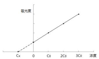 分別量取四份等量待測試樣(濃度為Cx),配制總體積相同的四份溶液。第一份不加標準溶液,第二、三、四份分別按比例加入不同濃度的標準溶液,四份溶液的濃度分別為:Cx、Cx+Co、Cx+2Co、Cx+3Co;加入標準溶液Co的濃度約等于0.5倍量的試樣濃度,即Co≈0.5Cx。用空白 溶液調零,在相同條件下依次測定四份溶液的吸光度。以吸光度為縱坐標,加入標準溶液的濃度為橫坐標,繪制校準曲線,曲線反相延伸與橫坐標的交點即為待測試樣的濃度。待測試樣濃度與對應吸光度的關系見圖A.1。
