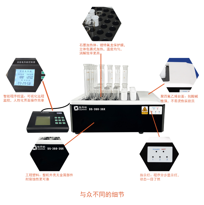 DS-360-36X線控石墨消解儀(36位)主要用于實驗室樣品前處理中進行加熱、趕酸、消解的設備,比實驗電熱板效率高、成本消耗低,石墨消解儀采用高純石墨作為加熱體,包裹式加熱,溫度均勻充分消解樣品。多孔的設計,輕松實現了批量的處理樣品,拋棄傳統單一的消解模式,是您樣品消解的必備實驗室裝備之一。
