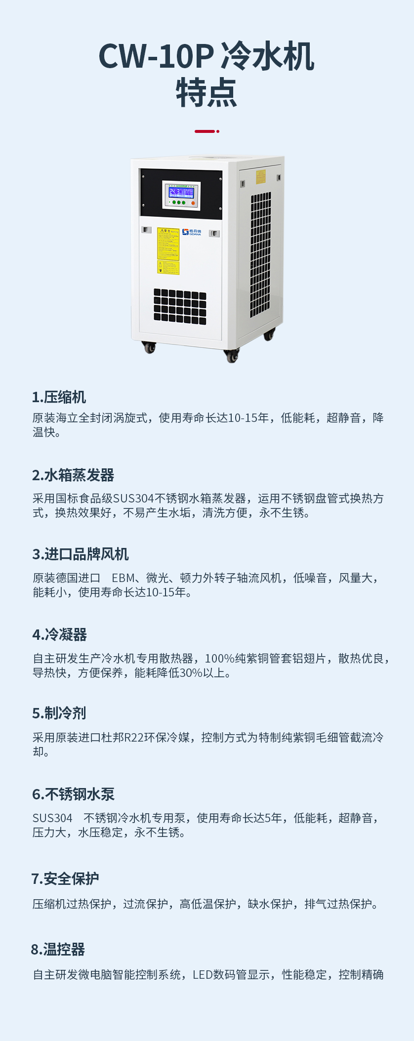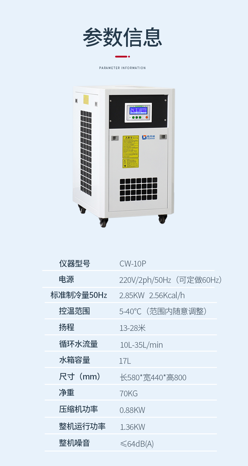 冷水機制冷系統將水箱內的水冷卻,而后機器內部的水泵把低溫的水注入需要冷卻的設備內。水帶走機器內部的熱量,變成高溫的水后回流到水箱進行降溫,如此循環交換冷卻,起到為設備冷卻的作用。