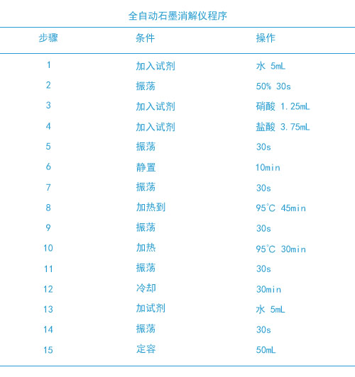 本文章采用全自動(dòng)石墨消解儀作為無(wú)機(jī)樣品前處理,采用濕法消解原理,可將復(fù)雜的試驗(yàn)步驟全部程序化,只需電腦上設(shè)置好一鍵啟動(dòng)就可以自動(dòng)加酸、搖勻、振蕩、加酸、趕酸、消解、冷卻、定容。下面根據(jù)《土壤質(zhì)量總汞、總砷、總鉛的測(cè)定原子熒光法》標(biāo)準(zhǔn)方法處理土壤樣品。