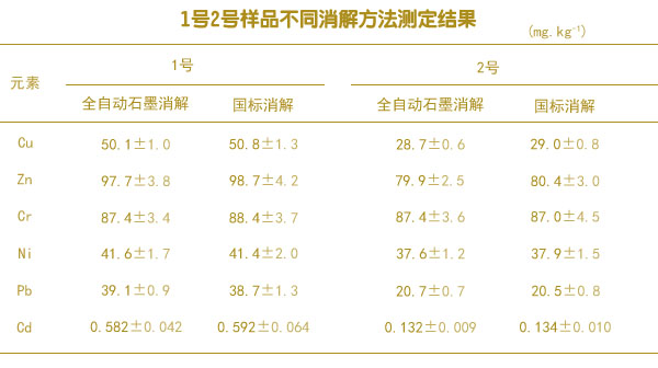 準確稱取采集的樣品l號和2號樣品,分別使用全自動石墨消解法和國標推薦法對樣品進行消解處理,每個樣品每個方法分別消解6個,統一測定消解液中6種重金屬元素的含量測定結果如下表。由表中可知,全自動石墨消解法和國標推薦方法的測定值基本趨于一致。