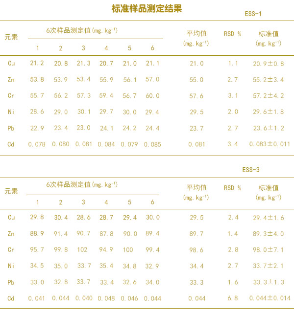 分別準確稱取ESS一1和ESS一3標準土壤樣品各6份,標準樣品轉移至石墨消解儀樣品管中,放進相應的樣品位置,統一測定消解液中6種重金屬元素的含量,測定結果如上面的表格。結果得出2個土壤標準樣品中的6種重金屬元素測定值均在不確定度范圍內,且相對標準偏差均小于7%。