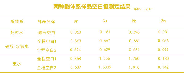 釆用硝酸-雙氧水和王水消解土壤和底泥樣品,由于沒有加氫氟酸飛硅的步驟,因此消解液中留有殘渣,用中性濾紙過濾后定容,因此濾紙空白值的大小直接影響方法檢岀限和測定結果。本研究對兩種體系均進行了空白值實驗,表(兩種酸體系樣品空白值測定結果)中的結果表明該前處理體系試劑空白低,可以適用于浸提。