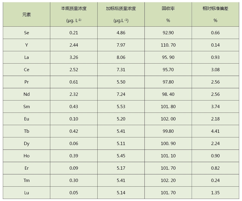 從表中可以看出,使用該方法消解茶葉測(cè)定其中的稀土含量,具有很好的回收率和精密度,加標(biāo)回收率和精密度(RSD)分別為92.9%~110.7%和0.24%~4.41%,實(shí)驗(yàn)結(jié)果滿(mǎn)足要求,該方法可靠,同時(shí)適用于其它植物類(lèi)的應(yīng)用。