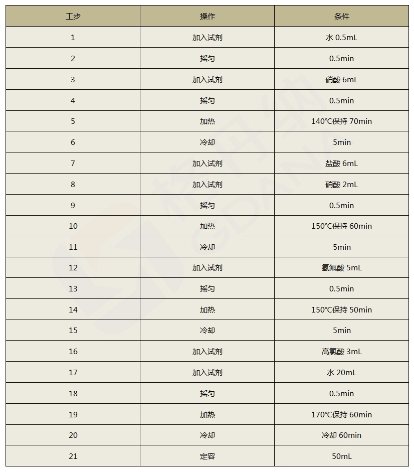 啟動全自動石墨消解儀,開始加入0.5mL水于樣品中,震蕩搖勻0.5min,加6mL硝酸,震蕩搖勻0.5min,溫度加熱至140℃加熱70min,冷卻5min;加6mL鹽酸和2mL硝酸,震蕩搖勻0.5min,150℃加熱60min,冷卻5min;加5mL氫氟酸,震蕩搖勻0.5min,加熱至150℃加熱50min,冷卻5min;加3mL高氯酸,加20mL水沖洗甭管,震蕩搖勻0.5min,再加熱至170℃加熱60min,冷卻60min,定容至50mL。同時做空白樣實驗。