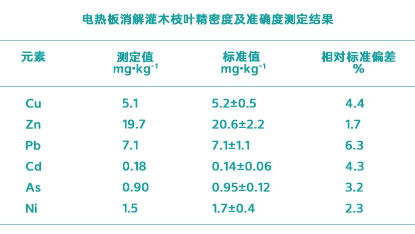 由表中得出,實驗測定值均在標準值范圍內,滿足實驗要求,電熱板消解方法適用于甘蔗、植物等的消解。