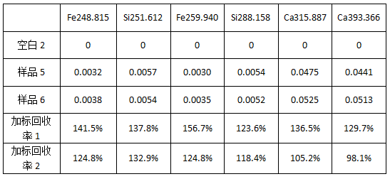 從加標回收率數據可知,鐵和鈣的數據均在范圍內,硅的干擾較大,可能是實驗稀釋和轉移過程中,引入了雜質,造成回收率偏高。
