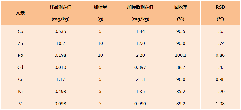 根據(jù)上述的方法,用陶瓷電熱板消解糖蜜后測(cè)定Cu、Zn、Pb、Cd、Cr、Ni、V7種元素加標(biāo)回收率及精密度所以下表所示。