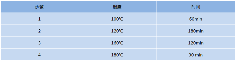 稱取0.2g(精確至0.1mg)樣品于聚四氟解管中,用少量水潤濕;加入5ml鹽酸。打開平板啟動設置好的程序開始加熱(消解程序下如表),100℃消解保持60min;加5ml硝酸、5ml氫氟酸、1ml高氯酸,加蓋,120℃消解保持180min;開蓋,160℃消解保持120min;最后溫度提高到180℃趕酸,當加熱至冒濃厚高氯酸白煙時,加蓋,待消解管壁上的黑色有機物消失后,開蓋,驅趕白煙并蒸至內容物呈不流動狀態(tài)的液珠狀。用1%硝酸溫熱溶解可溶性殘渣,轉移至25ml容量瓶中定容,搖勻,待測。同時做空白樣品。